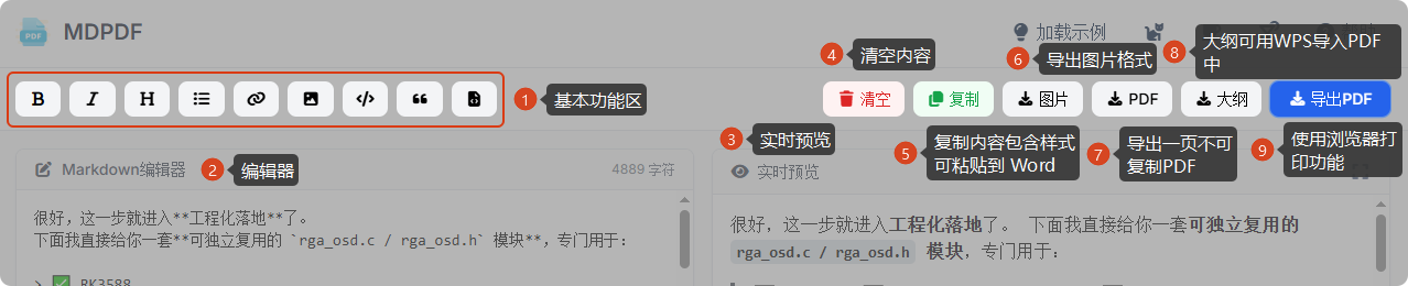 MDPDF 是一款将 Markdown 格式的内容转成 PDF 格式的在线工具,类似 Typora 软件,不局限于 PDF